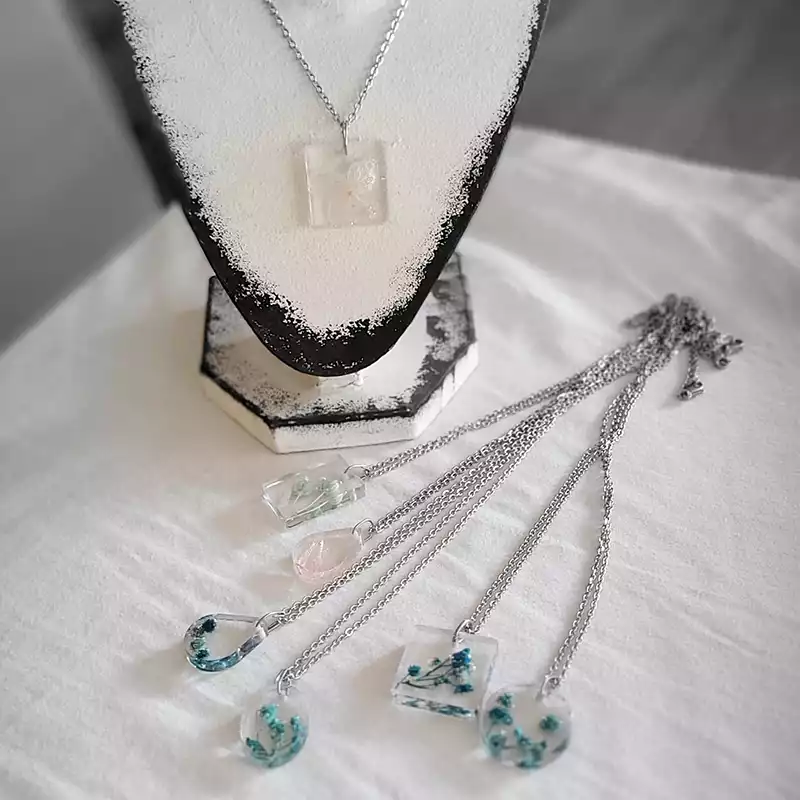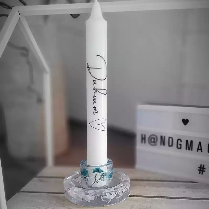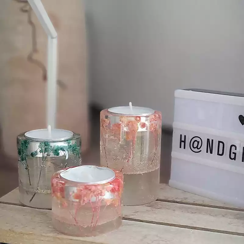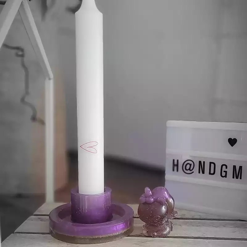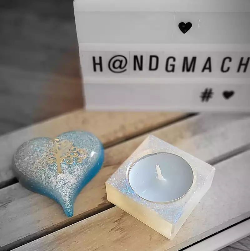Epoxidharz verwende ich sowohl für kleine Schmuckanhänger und Magnete, als auch für größere Teile wie Kerzenhalter und Figuren. Eingegossen wird dabei Glitzer, Sand, Trockenblumen,...