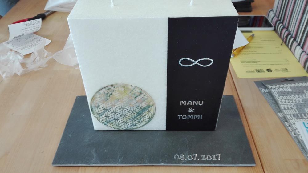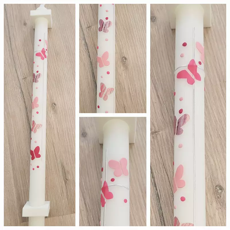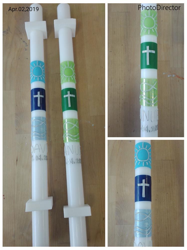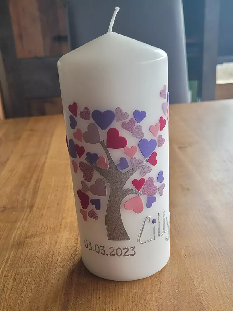 Ich verziere die Kerzen ohne Aufpreis nach Kundenwunsch. Ob mit den Initialen des Brautpaars und dem Datum als besondere Erinnerung an den Hochzeitstag, als Geburtstags-, Weihnachts- oder Osterkerze, an der schönen Zierde werden Sie sich jedes Jahr aufs Neue erfreuen. Neben dem Motiv können Sie natürlich auch die Farbe frei wählen.