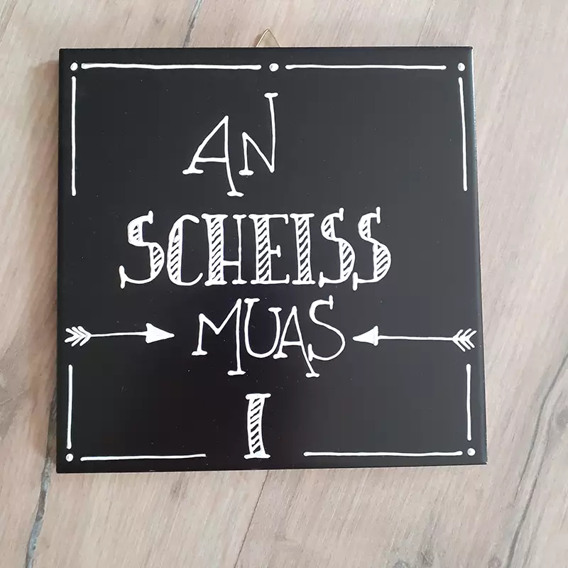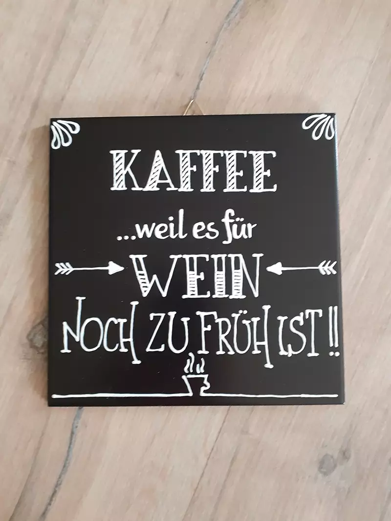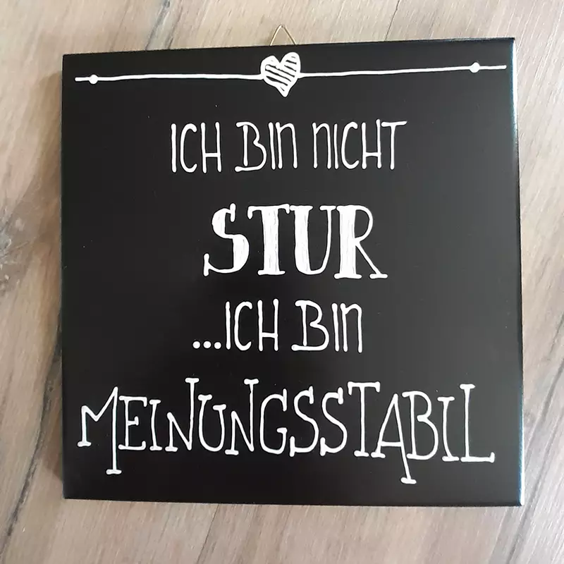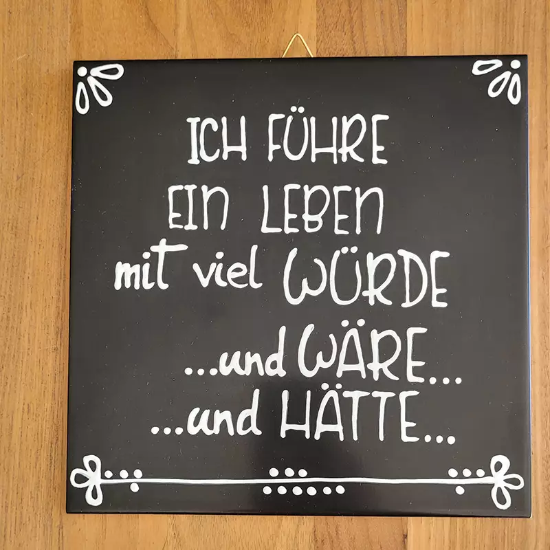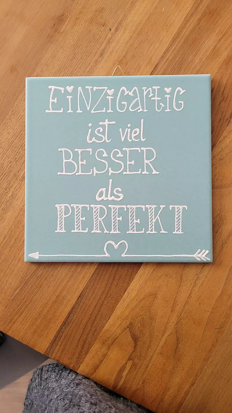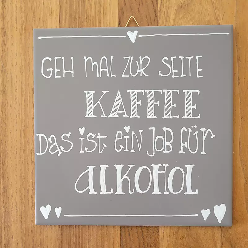 Den Untergrund für die Spruchbilder bilden Keramikfliesen im Format 20/20 cm mit Aufhängung. Sie werden in meinem Atelier in der Tradition des handlettering frei Hand mit diversen Motiven und Motivsprüchen beschrieben, die ihnen einen individuellen Charakter verleihen. Vom Sinnspruch über Trink- und Motivationssprüche bis zu kleinen Lebensweisheiten – hier ist für jeden das Passende dabei.