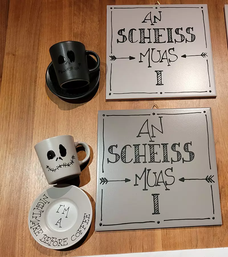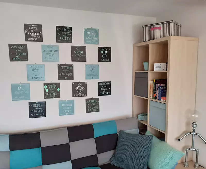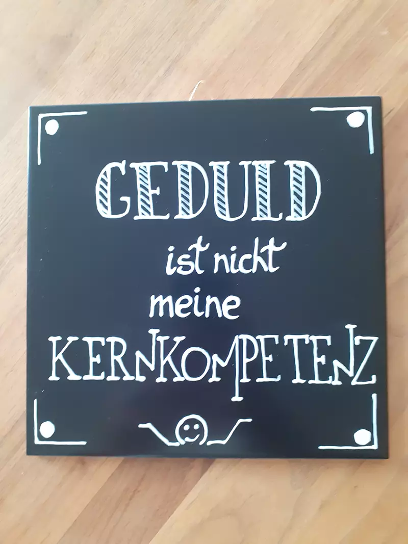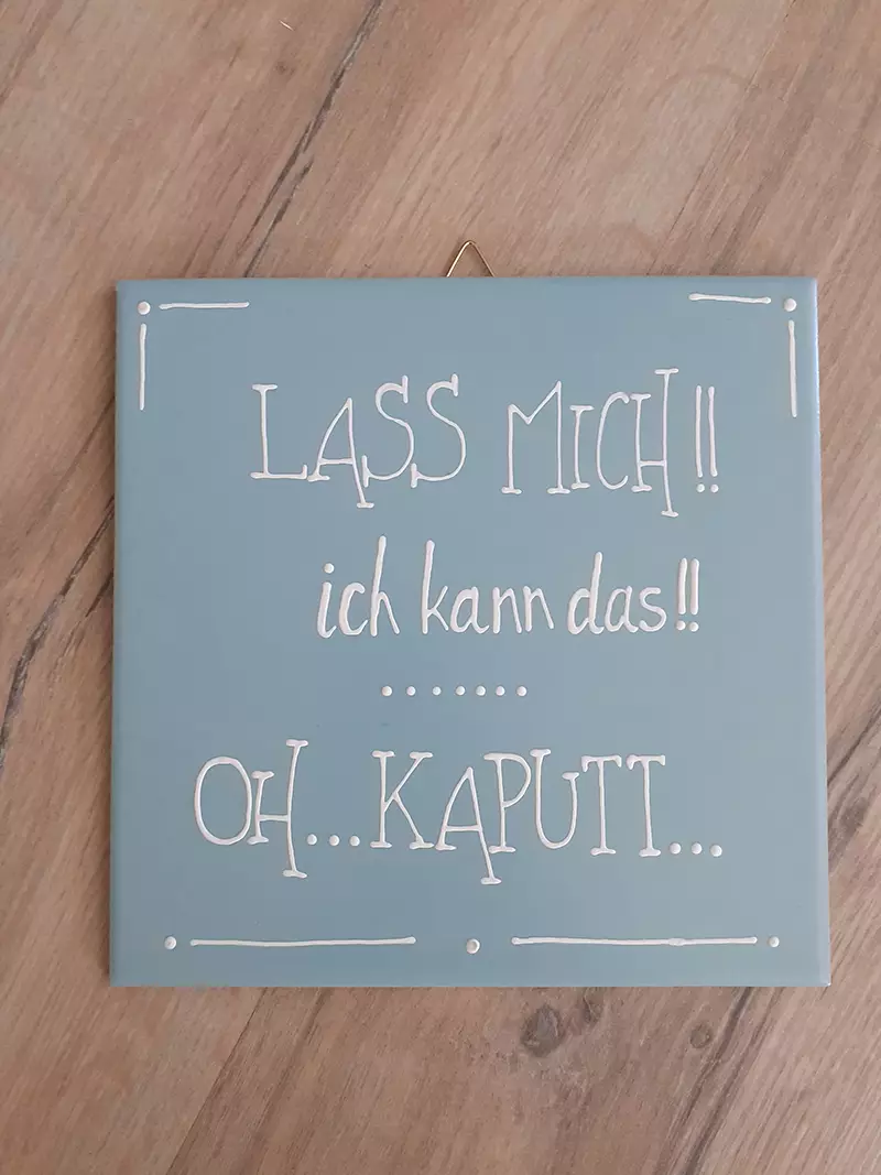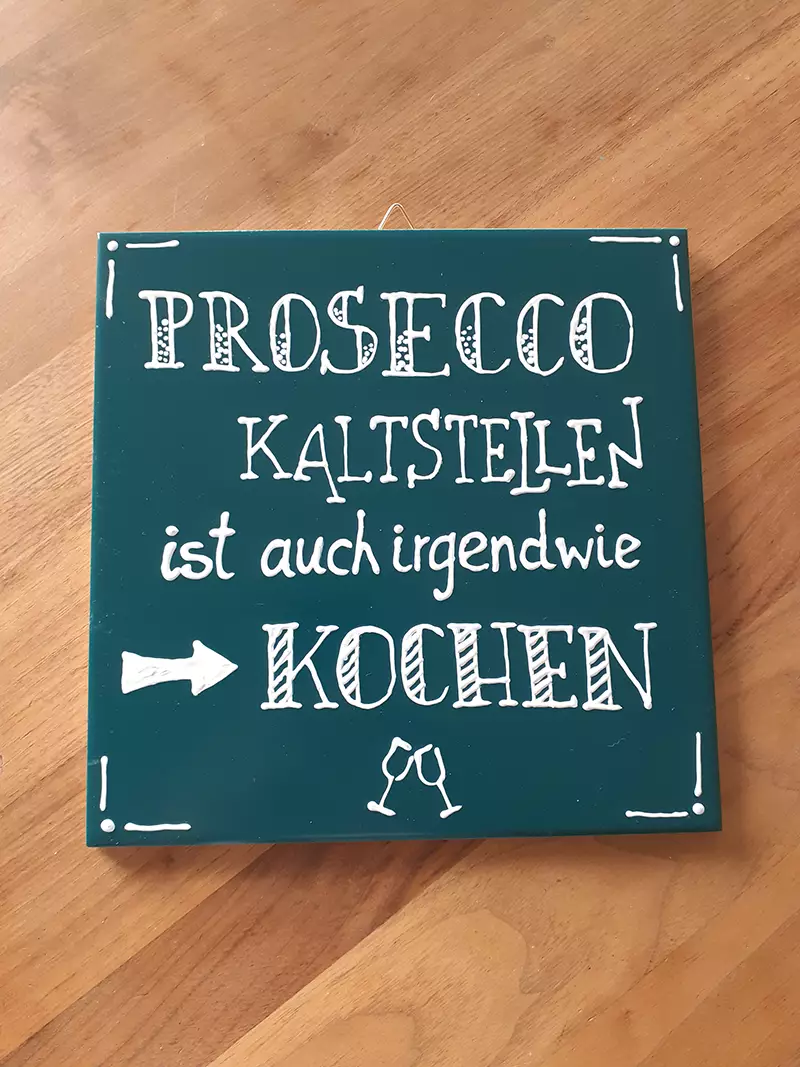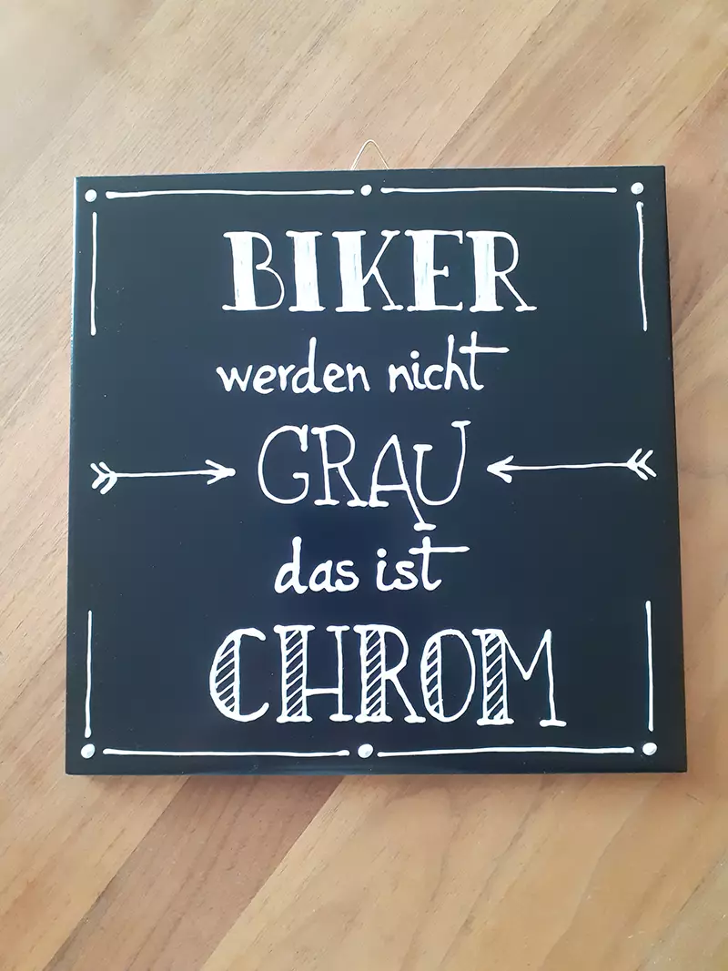Den Untergrund für die Spruchbilder bilden Keramikfliesen im Format 20/20 cm mit Aufhängung. Sie werden in meinem Atelier in der Tradition des handlettering frei Hand mit diversen Motiven und Motivsprüchen beschrieben, die ihnen einen individuellen Charakter verleihen. Vom Sinnspruch über Trink- und Motivationssprüche bis zu kleinen Lebensweisheiten – hier ist für jeden das Passende dabei.
